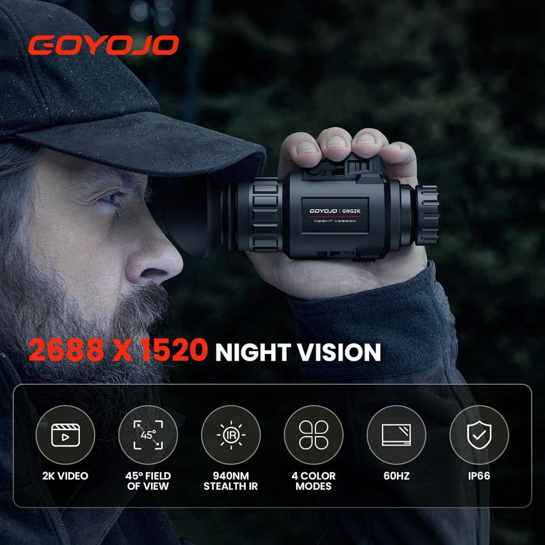 Experience ultimate night vision clarity with the GOYOJO GNG2K Monocular. Featuring 2K resolution and a 60Hz refresh rate, it delivers crisp images even in total darkness. The stealthy 940nm infrared and 0.0001 Lux sensor ensure covert night operations, while 4 color modes adapt to any environment. Lightweight and helmet-mountable, it’s perfect for tactical use, hunting, camping, and outdoor adventures.
