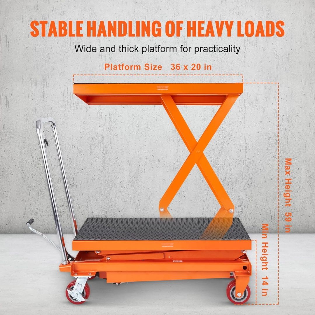 Effortlessly lift, transport, and handle heavy loads with the VEVOR Hydraulic Lift Table Cart. Designed for durability and smooth operation, this manual double scissor lift table features a 770 lbs capacity and a maximum lifting height of 59 inches. Equipped with four sturdy wheels and a non-slip pad, it ensures stability and safe material handling. Ideal for warehouses, workshops, and industrial environments, this hydraulic scissor cart makes moving heavy items easier and more efficient.