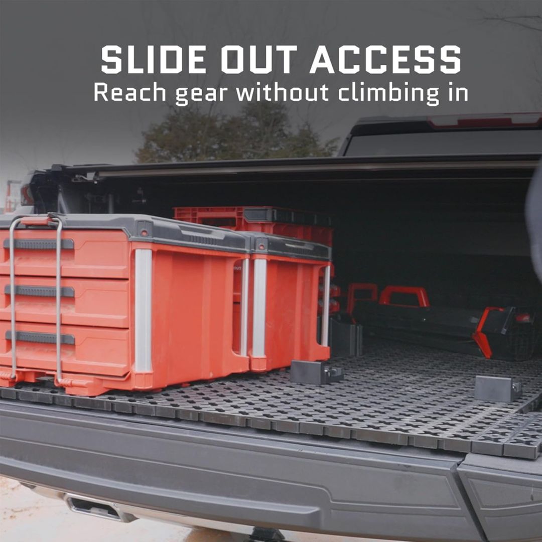 The mat installs easily without drilling and stays between the wheel wells so you can slide it out toward the tailgate for quick access to your stored cargo. Ideal for enclosed or covered beds (like with a tonneau or camper shell), it’s also compatible with drawer systems, bed slides, or custom setups.