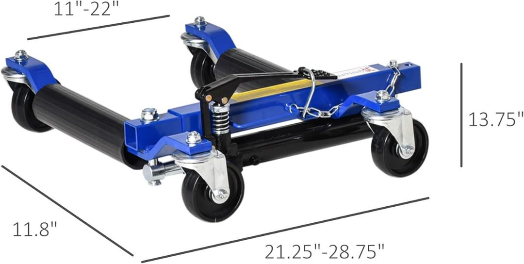 This TUFFIOM mechanical wheel dolly jack set is built to give you full control when moving or repositioning vehicles in tight spaces. Each dolly is engineered to support up to 1500 lbs, allowing you to safely lift and roll a wide range of cars without needing an external jack. Designed to accommodate wheels up to 12 inches wide, the twin-roller platform keeps the tire securely in place during lifting and movement.