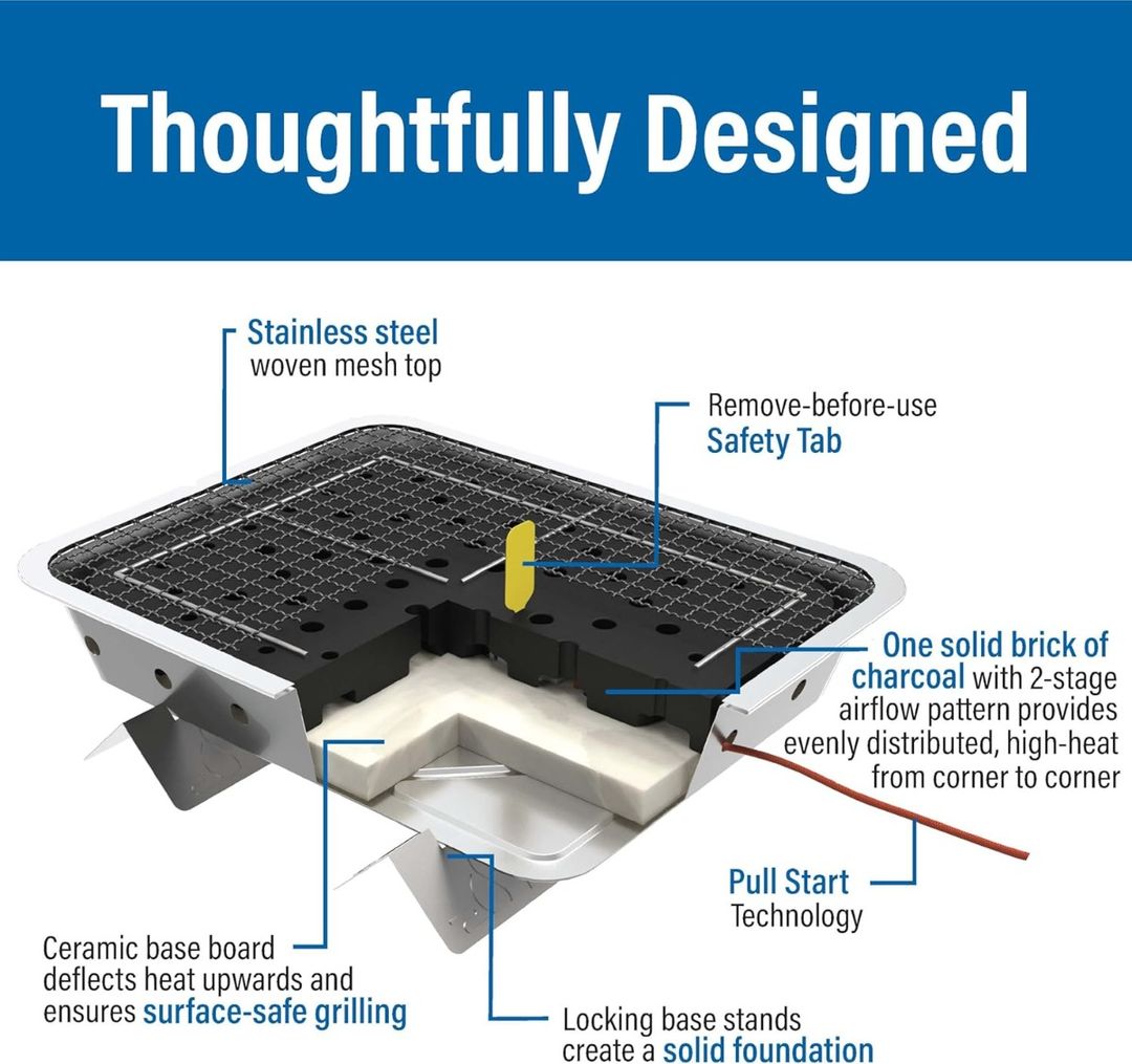 With a long-lasting burn time of up to 3 hours, this portable grill is perfect for camping, tailgating, picnics, and outdoor gatherings. No setup and no cleanup required—simply light, grill, and dispose responsibly after use.