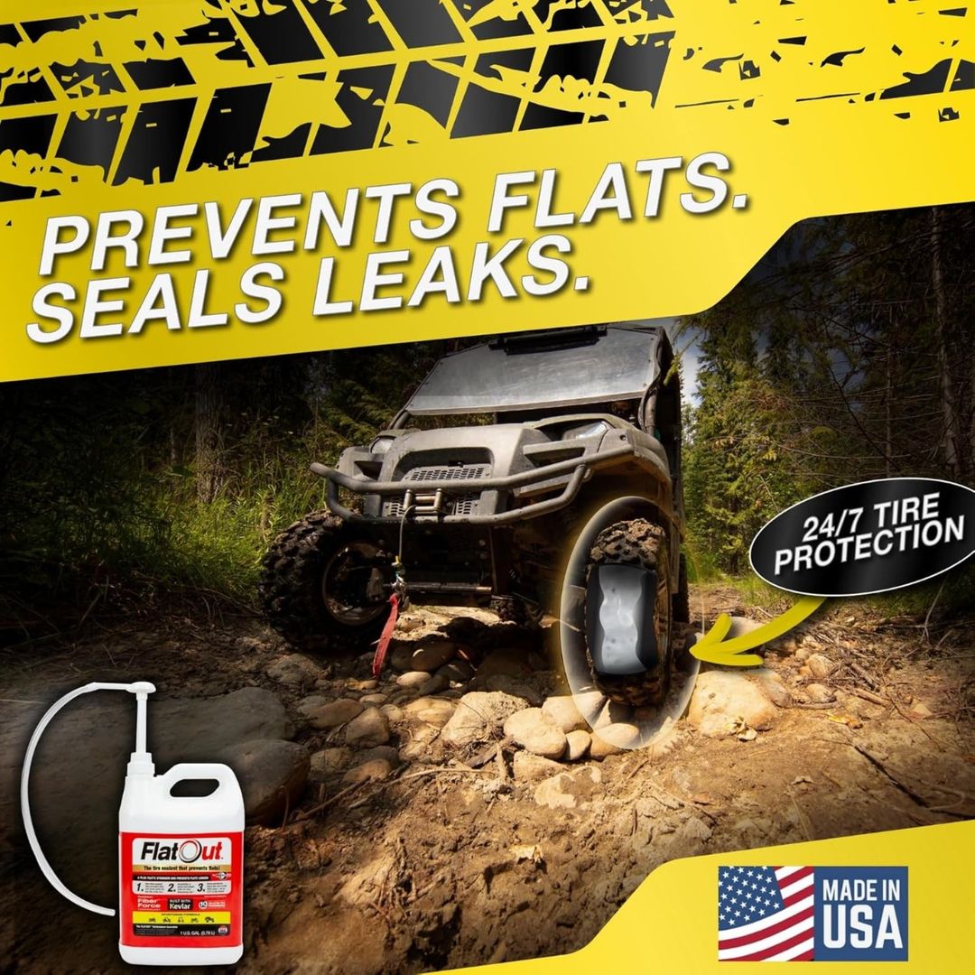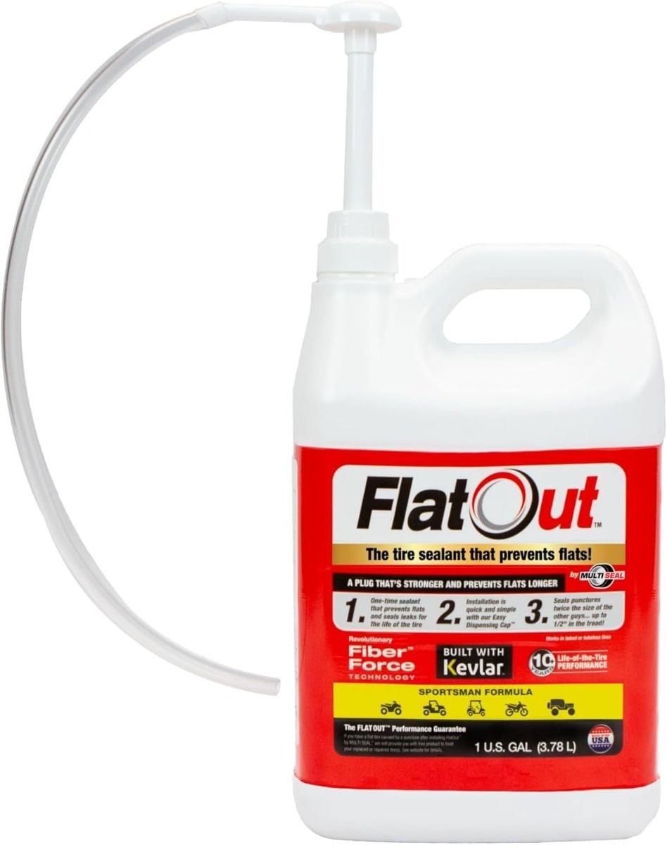 Keep your tires running smooth and flat-free with Flat Out Tire Sealant Sportsman Formula. This fast-acting, high-performance sealant is specially designed for tubeless tires, sealing punctures and leaks instantly. Infused with Kevlar fibers, it strengthens tire integrity and prevents recurring flats. Perfect for all types of vehicles, off-road adventures, or daily driving, it ensures long-lasting protection. Comes with a convenient valve core tool for easy application. Each 1-gallon container provides plenty of sealant for multiple uses, giving you peace of mind on every ride.